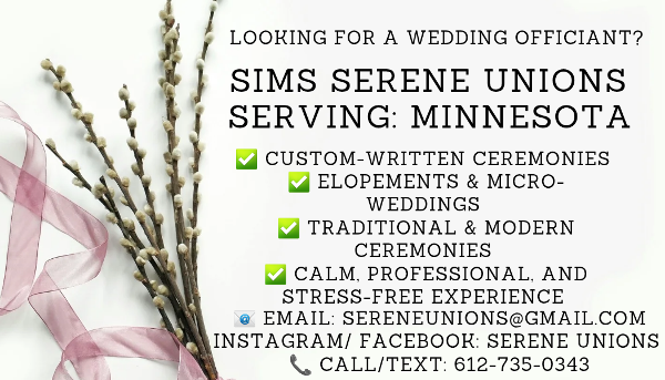Looking for a warm, professional wedding officiant in Minnesota? Whether it's a quick elopement, an intimate gathering, or a grand celebration, I create heartfelt, customized ceremonies that reflect your unique love story.